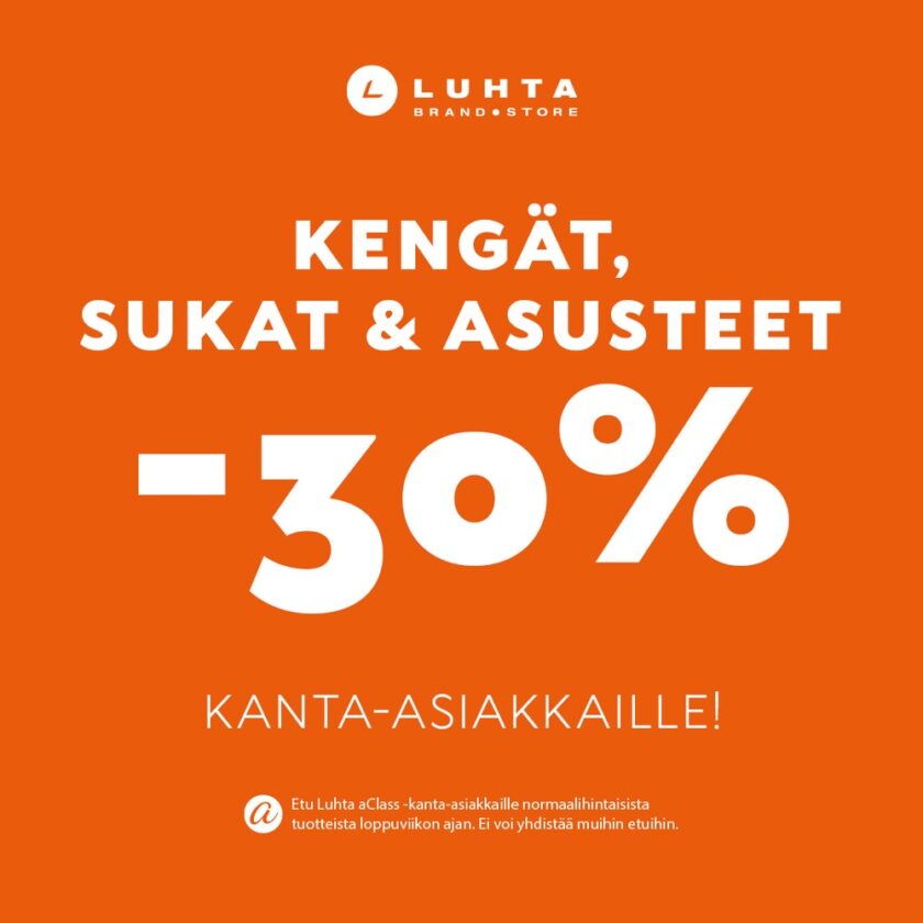 Kengät, sukat ja asusteet –30 % kanta-asiakkaille! Valitse omasi Luhta Brand Storen monipuolisesta valikoimasta. Etu koskee normaalihintaisia tuotteita ja on voimassa su 16.11. asti.